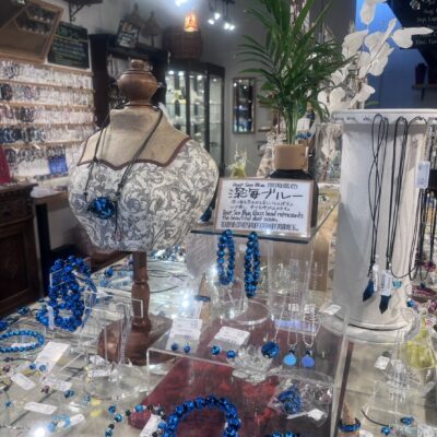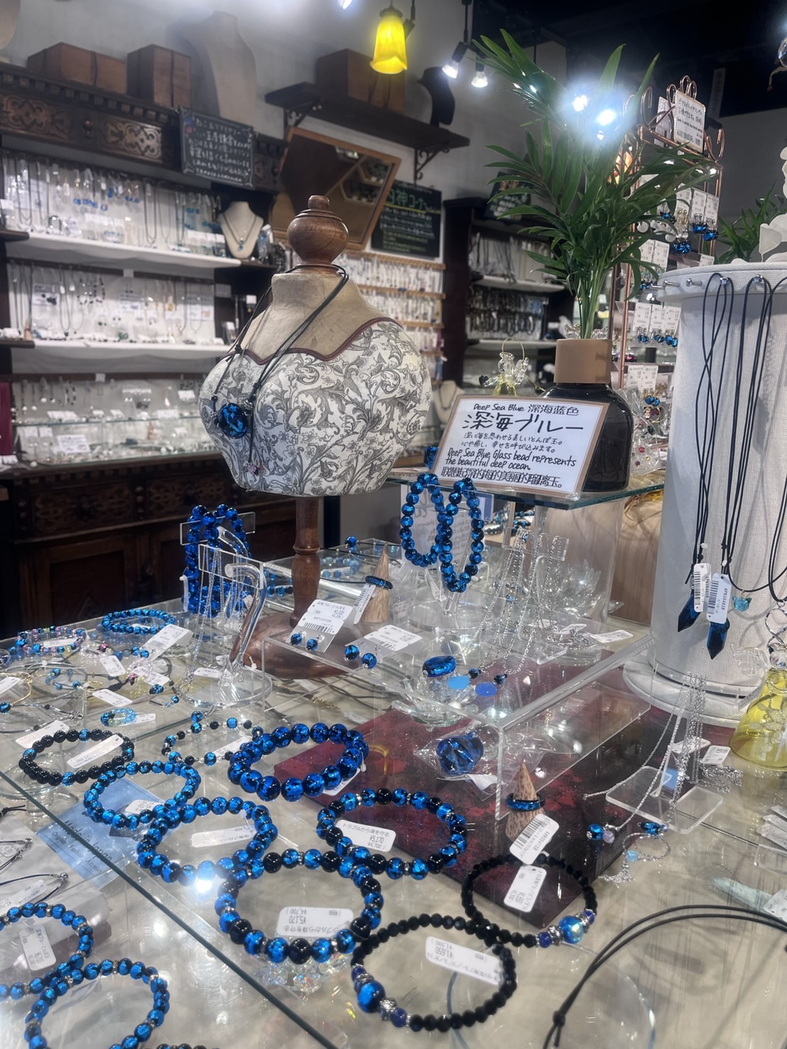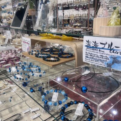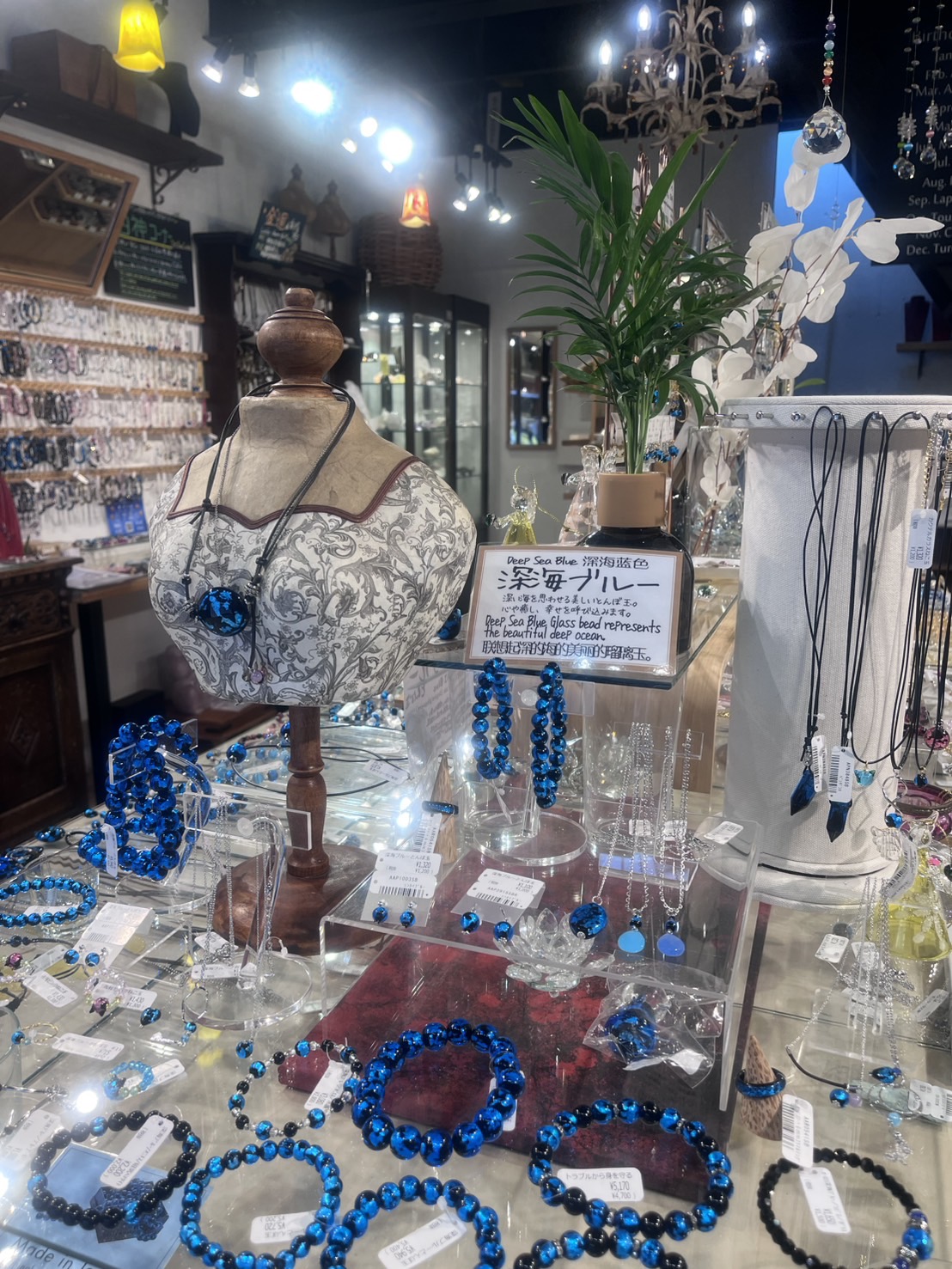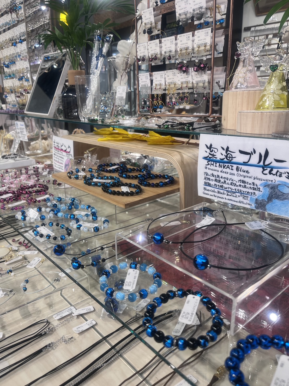お店の一番人気は当店オリジナルとんぼ玉「深海ブルー」、鎌倉の海を思わせるような鮮やかな色合いです。
